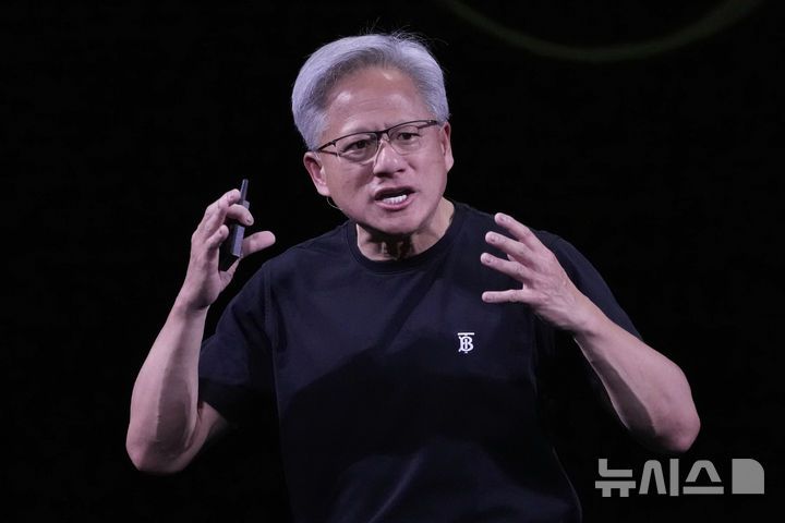 [파리=AP/뉴시스] 세계 최대 인공지능(AI) 반도체 기업인 엔비디아가 최신 AI칩 블랙웰을 처음으로 미국에서 생산했다. 사진은 젠슨 황 엔비디아 최고경영자(CEO)가 지난 6월 11일(현지 시간) 프랑스 파리에서 열린 비바테크 박람회에서 기조연설을 하고 있는 모습. 2025.10.20.