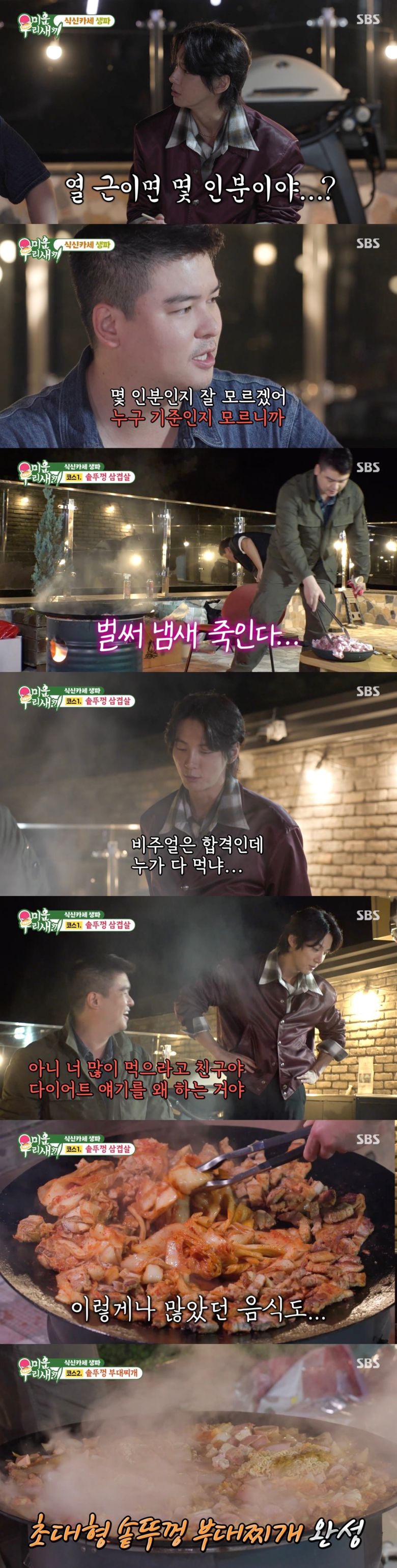 가장 먼저 초대형 솥뚜껑에 엄청난 양의 삼겹살을 올렸다. 이를 본 윤시윤은 "몇 인 분이냐?"라고 물었다.