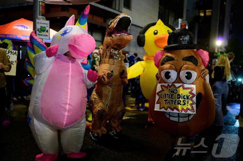 18일(현지시간) 미국 오리건주 포틀랜드에서 반이민세관단속국(I.C.E.) 시위대가 형형색색의 커다란 캐릭터 복장을 입고 이민세관단속국 건물 앞에서 춤을 추며 퍼포먼스를 펼치고 있다. 그중 감자 인형의 가슴에는 "No Little Dick Taters!"라는 문구가 적혀 있는데, 이는 '작은 독재자 따위는 사절!'이라는 의미의 말장난으로, 영어 단어 dictators(독재자)를 dick taters로 익살스럽게 비튼 표현이다. dick은 권위적인 사람 혹은 남성 성기를 지칭하는 표현이고 taters는 감자라는 뜻이다. ⓒ AFP=뉴스1 |