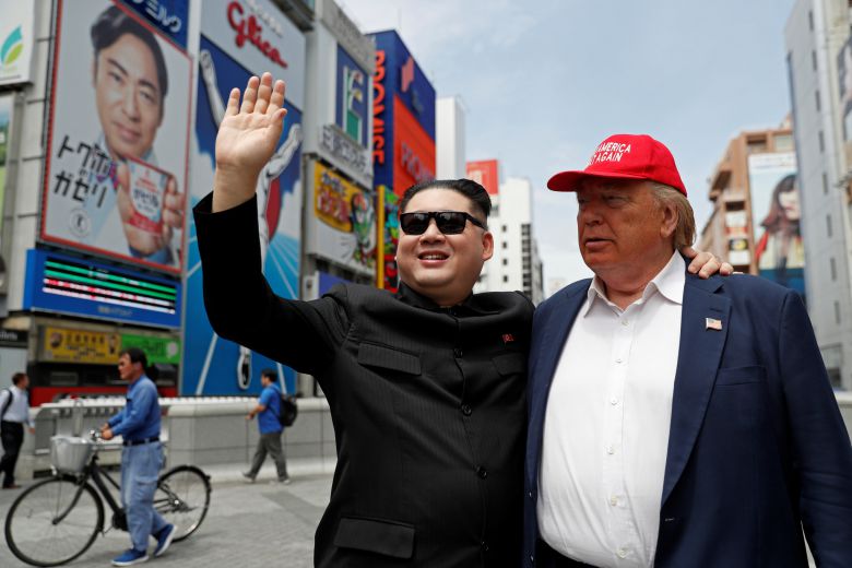 지난 2019년 6월 26일(현지시간) 일본 오사카에서 열린 주요 20개국(G20) 정상회의를 앞두고 열린 산책 행사에서 김정은 북한 국무위원장을 흉내 내는 호주인 하워드 X와 도널드 트럼프 미국 대통령을 흉내 내는 데니스 앨런이 대화하고 있다. 로이터=연합뉴스 |