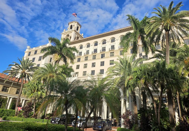 한국 기업 총수들과 이들을 트럼프 대통령과의 골프 회동에 초청한 손정의 일본 소프트뱅크 회장이 묵은 것으로 추정되는 플로리다주 팜비치 섬의 5성급 호텔의 모습. 이들이 단체 이동한 것으로 알려진 검정 리무진 버스가 지난 18일(현지시간) 골프 라운딩을 마친 뒤 이 호텔로 들어갔으며, 손 회장의 모습이 호텔 로비에서 목격됐다. 연합뉴스