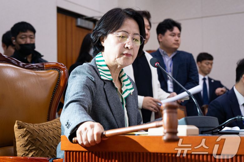 추미애 국회 법제사법위원장이 20일 서울 여의도 국회 법제사법위원회에서 열린 서울고법·서울중앙지법 등에 대한 국정감사에서 감사개시를 선언하고 있다. 2025.10.20/뉴스1 ⓒ News1 유승관 기자 |