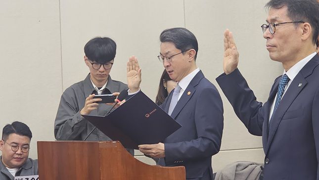 이억원 금융위원장이 20일 국회에서 진행된 정무위원회 국정감사에서 증인 선서를 하고 있다. /사진=비즈워치
