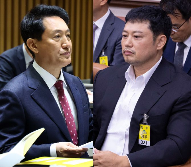 오세훈(왼쪽) 서울시장이 20일 서울시청에서 열린 서울시에 대한 국회 국토교통위원회 국정감사에 참석해 있다. 오른쪽은 지난 13일 국회 교통위원회 국정감사에 참고인으로 출석한 양치승 바디스페이스 대표 (사진=연합뉴스) |