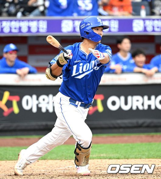[OSEN=대전, 이대선 기자] 19일 오후 대전 한화생명볼파크에서 2025 신한 SOL Bank KBO리그 포스트시즌 플레이오프 2차전 한화 이글스와 삼성 라이온즈의 경기가 열렸다.한화는 라이언 와이스, 삼성은 최원태를 선발 투수로 내세웠다.5회초 1사 1루에서 삼성 김태훈이 우전 안타를 치고 있다. 2025.10.19 /sunday@osen.co.kr
