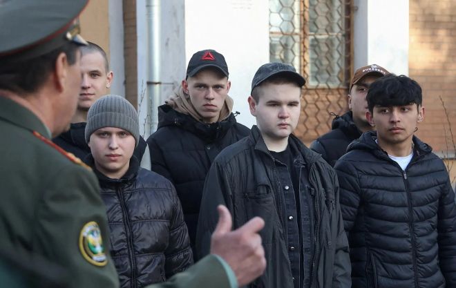 지난 4월 러시아 레닌그라드 지역의 모병센터에서 입대를 앞둔 청년들의 모습. 로이터 연합뉴스 자료사진 |
