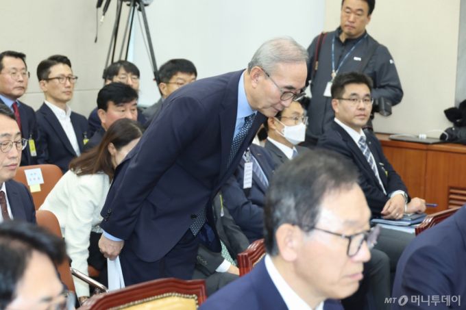 [서울=뉴시스] 고승민 기자 = 김영섭 KT 대표가 21일 서울 여의도 국회에서 열린 과학기술정보방송통신위원회의 정보통신산업진흥원 등 국정감사에 출석, 인사하고 있다. 2025.10.21. /사진=고승민 |