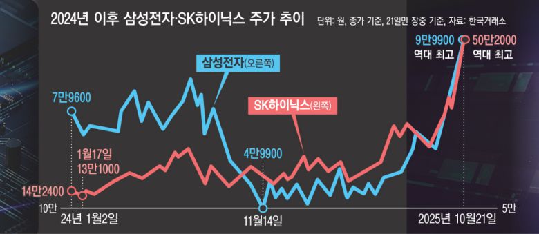 SK하이닉스는 이날 장중 50만2000원을 기록하며 ‘50만닉스’를 달성했다. 삼성전자는 9만9900원까지 상승하면서 ‘10만전자’까지 100원만을 남겨놓기도 했다. 주가가 치솟으면서 이날 장중 삼성전자(우선주 포함)와 SK하이닉스의 합산 시가총액이 1000조원을 넘기기도 했다. 코스피 시총의 30% 이상이 삼성전자와 SK하이닉스다.