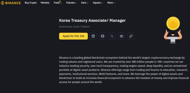 22일 금융계에 따르면 바이낸스는 최근 홈페이지에 한국 인력 채용 공고를 올렸다. 재무팀 실무 담당자로 3~5년의 경력자를 대상으로 모집하고 있다. 주 업무는 회사 자금 흐름 관리, 은행거래 지원, 유동성 및 현금흐름 보고 등 재무 전반이다. 근무지는 대한민국 서울로 영어와 한국어 능력을 필수로 한다. 다만 현재 바이낸스 한국 인력과 같이 아시아태평양으로 소속으로 업무를 담당할 예정이다.