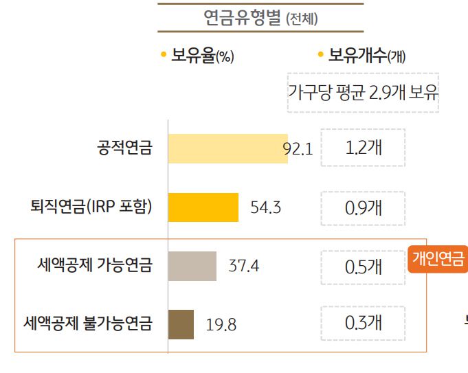 이는 은퇴가구의 대부분이 공적연금에 의존하고 있는 영향이 크다. 국민연금을 포함한 사학·군인·공무원연금의 공적연금을 보유한 은퇴가구는 92.1%로 가장 많았지만, 퇴직연금과 개인연금을 보유한 가구는 각각 54.3%, 53.8% 에 불과했다.