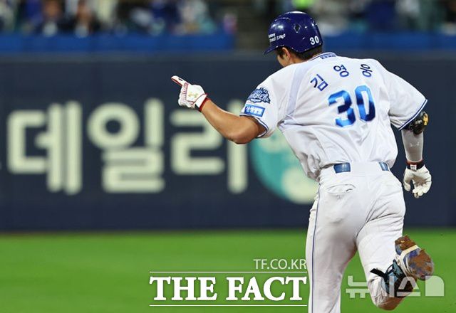 삼성 김영웅이 22일 한화와의 플레이오프 4차전서 8회말 우월 3점 홈런을 날린 뒤 홈으로 향하고 있다. /대구=뉴시스 |