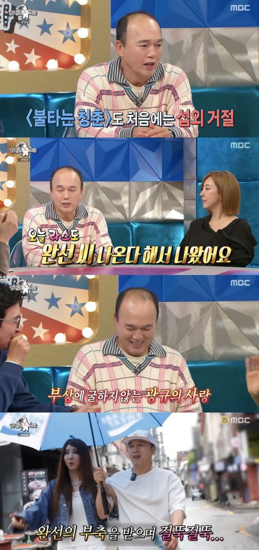 김구라는 “왜 거절했냐”라고 물었고, 김광규는 “저는 젊게 보이고 싶은데”라며 “사무실에서 조금 자제를 시켜서 안 나갔다. 근데 사무실 의견을 무시하고 완선 씨가 부르면 나가야겠다 해서 나갔다. 너무 재밌어서 5년을 하게 됐다. 오늘 ‘라스’도 완선 씨 나온다고 해서 나왔다. 호위무사로 나왔다”라며 일편단심 면모를 드러냈다.