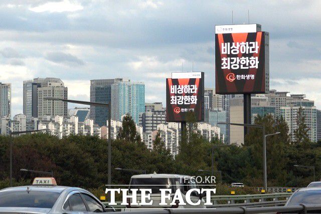 26년 만의 우승 염원이 얼마나 간절했을까. 22일 오후 <더팩트> 취재진이 찾은 서울 여의도 63빌딩 앞에는 올림픽대로 인근에 위치한 광고판이 주황빛 응원 물결을 만들고 있었다. 6개 전광판의 앞뒤 12면의 대형 디지털 스크린에 송출되는 '비상하라 최강한화 이글스여 비상하라', '나는 행복합니다, 이글스라 행복합니다' 등 프로야구 한화 이글스의 우승을 기원하는 메시지가 반복적으로 송출돼 눈길을 끈다.