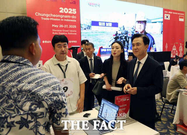 충남도가 9월 무역수지 1위와 수출 2위 자리를 굳건히 지켰다. 김태흠 지사(오른쪽 첫 번째)가 지난 5월 인도네시아에서 열린 수출 상담회에 참석해 바이어에게 충남 제품을 홍보하고 있다. /충남도