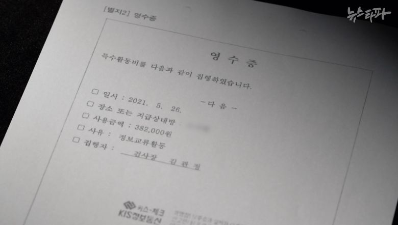 역대 서울동부지검장(2020~2024년)들이 자신에게 ‘셀프 지급’한 특수활동비 가운데 약 70%에서 회식비와 맛집 밥값 등으로 특수활동비를 부정 사용, 오남용한 정황이 나타났다. 나머지 30%는 지검장들이 사실상 아무런 증빙도 남기지 않은 채 전액 ‘현금’으로 가져간 특수활동비였다. 뉴스타파가 지검장 셀프 지급 특수활동비의 용처를 전수 검증한 결과, 특수활동에 썼다고 볼 수 있는 증빙은 단 하나도 없었다.