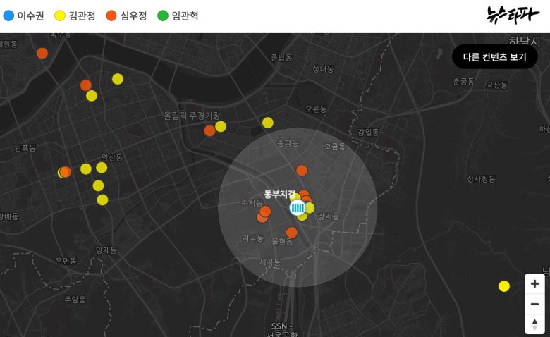 역대 서울동부지검장(2020~2024년)들이 자신에게 ‘셀프 지급’한 특수활동비 가운데 회식비와 맛집 밥값 등으로 부정 사용, 오남용한 정황이 나타난 내역을 지도에 시각화했다. 지도 위의 각 점을 클릭하면 셀프 지급 특수활동비가 어디에서, 얼마나 사용됐는지 상세 정보를 확인할 수 있다. (시각화 자료 전체화면 보기: https://pages.newstapa.org/2025/eastseoul_prosecutor/)