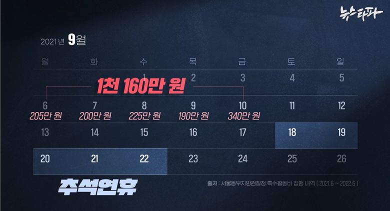 또 있다. ▲추석 연휴를 정확히 일주일 앞두고 있던 ▲2021년 9월 둘째 주, 심 전 총장은 이 한 주 동안만 ▲1,160만 원의 특수활동비를 몰아 썼다. 심 전 총장이 서울동부지검장으로 재임한 기간을 통틀어 ▲1주일 기준, 두 번째로 큰 규모의 특수활동비를 쓴 때였다.