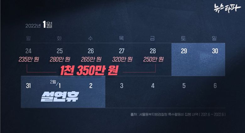2022년 1월, 심 전 총장은 다른 주엔 특수활동비를 전혀 지급하지 않다가 ▲1월 24일부터 시작하는 다섯 번째 주, 딱 이 한 주 동안만 ▲1,350만 원의 특수활동비를 몰아 썼다. 심 전 총장이 서울동부지검장으로 재임한 기간을 통틀어 ▲1주일을 기준으로 가장 큰 규모의 특수활동비를 쓴 때였다. ▲2022년 1월 다섯째 주는 그해 설 연휴가 시작되는 주였다.