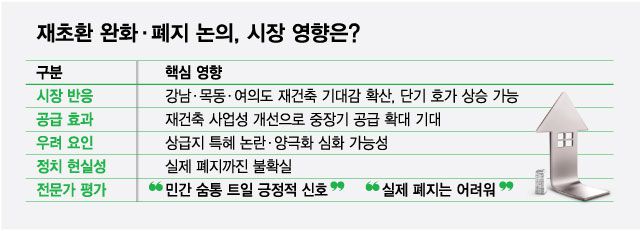 일각에선 정치적 현실을 감안하면 실제 재초환을 폐지하기까지는 쉽지 않다는 지적도 나온다. 한 시장 전문가는 "지금 정부와 여당이 규제 일변도라는 비판을 받는 상황에서 시장에 '기대 신호'를 던진 것일 수 있다"며 "실제 입법으로 이어질지보다는 시장 반응을 관찰하기 위한 메시지성 발언으로 보는 시각도 있다"고 덧붙였다.