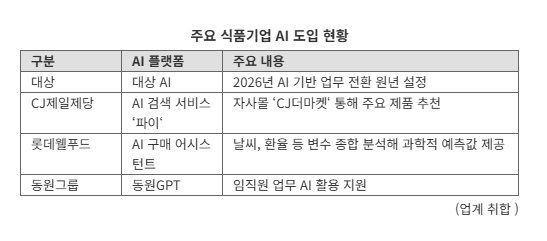 [파이낸셜뉴스] 생성형 인공지능(AI) 열풍과 맞물려 국내 식품업계가 AI 도입을 통해 경영 효율성, 신제품 개발, 원가 관리 등 혁신을 가속화하고 있다. 챗봇, 자동화 시스템 등 AI 기반 기술이 생산·유통·고객 서비스 전반으로 확산되고 있다.