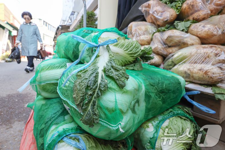 배추 등 김장 재료 가격이 내려가면서 김장물가가 열흘 만에 7.9% 하락한 것으로 나타났다. 한국농수산식품유통공사(aT) 등에 따르면 지난 22일 기준 배추 20포기를 김장할 때 소요되는 비용은 20만 4315원으로 조사됐다. 24일 서울 동작구 흑석시장에서 배추와 무 등 김장 채소가 판매되고 있다. 2024.11.24/뉴스1 ⓒ News1 민경석 기자 |