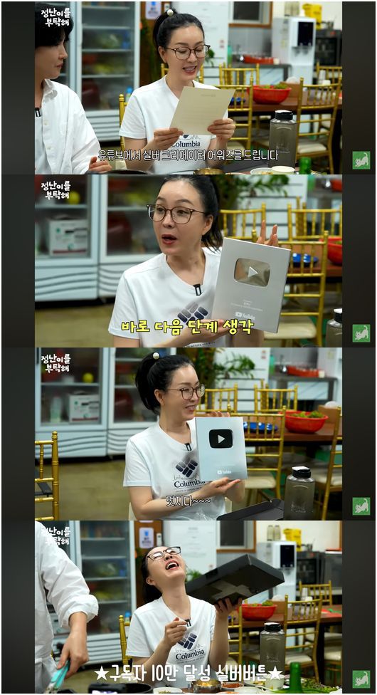 김정난은 깜짝 놀라면서 “세상에 내 이름이 새겨져 있다. 그 다음은 뭐냐”, “‘구독자 10만 구독자를 달성하여 유튜브에서 실버크리에이터 어워즈를 드립니다. 축하합니다’ 와아!”라며 기쁨을 드러냈다.