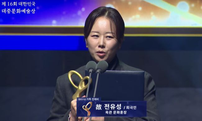 이 가운데 무대에는 대리 시상을 위해 딸 전제비는 "귀한 상 주셔서 감사하다. 아버지의 마지막 업적이 아니고, 새로운 기억으로 여기겠다”, “감사하다”라는 짧고 굵은 소감을 전했다.