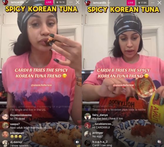 미국 팝스타 카디비가 인스타그램 라이브 방송에서 한국의 고추참치를 먹고 있다. 커뮤니티 캡처 |