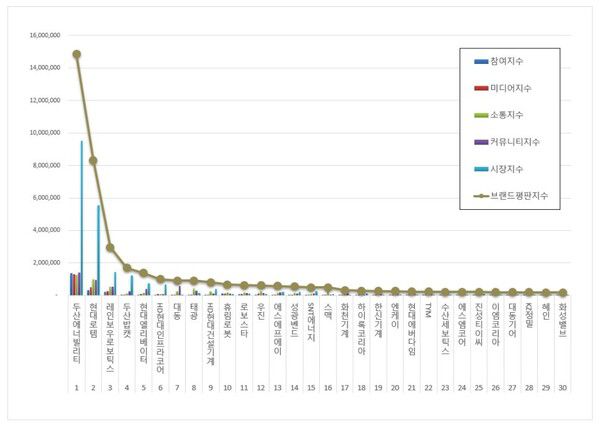 4위 두산밥캣 브랜드는 브랜드평판지수 1,697,165로 전월 대비 3.44% 상승했으며, 5위 현대엘리베이터는 1,382,477로 4.93% 하락했다.