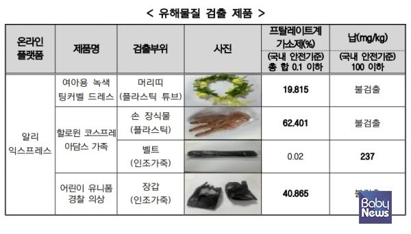 3개 제품의 머리띠, 장갑, 장식품에서 프탈레이트계 가소제가 국내 안전기준(0.1% 이하)을 최대 624배(19.8~62.4%) 초과하여 검출됐고, 이 중 1개 제품의 벨트에서는 납이 국내 안전기준(100㎎/㎏ 이하)보다 2.3배(237mg/kg) 더 검출됐다.