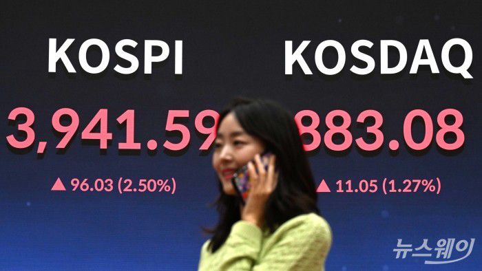 코스피 지수가 우리나라 사상 최초로 3940선을 돌파한 24일 오후 서울 여의도 한국거래소에 마련된 현황판에서 코스피·코스닥 종가가 보이고 있다. 이날 코스피는 전 거래일 종가보다 96.03포인트(2.50%) 인상된 3941.59로 거래를 끝냈으며 이는 장 마감 기준 최고가다. 사진=강민석 기자 kms@newsway.co.kr |
