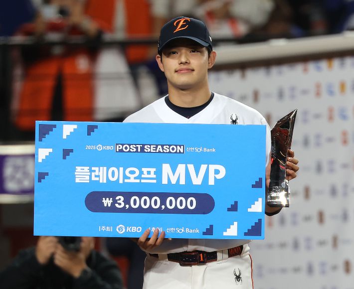 한국시리즈에 진출한 한화 이글스 투수 문동주가 24일 대전 한화생명 볼파크에서 열린 2025 프로야구 KBO 리그 포스트 시즌 플레이오프 5차전 을 마친 뒤 플레이오프 MVP를 수상하고 있다. 연합뉴스 |