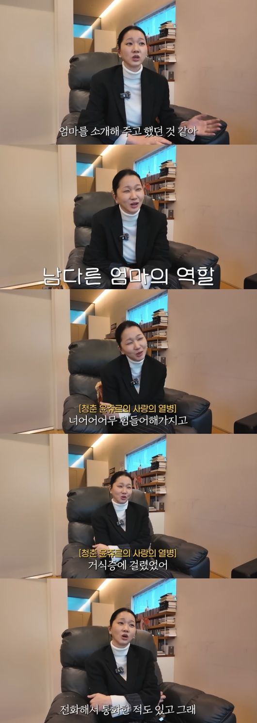 장윤주는 “엄마는 많은 남자친구들을 봤다. 다 데리고 갔다. 왜 그랬는지 모르겠는데 엄마가 다 봤다. 첫 남자친구랑 헤어지고 힘들어할 때 엄마가 전화해서 ‘우리 윤주 어떻게 안 될까요?’ 이런 걸 대신 한 적도 있다. 너무 힘들어해서 내가 거식증에 걸렸다”라고 말해 충격을 안기기도 했다.