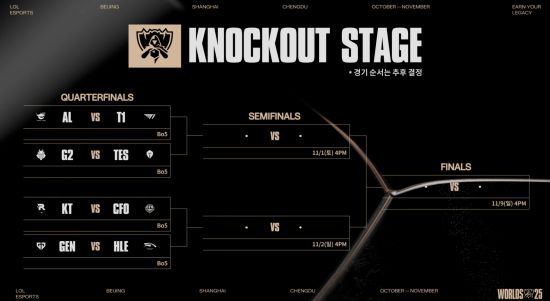 (엑스포츠뉴스 유희은 기자) 리그 오브 레전드 2025 월드 챔피언십(이하 월즈) 8강 대진이 확정됐다. 8강은 10월 28일부터 31일까지 4일간 중국 상하이 메르세데스-벤츠 아레나에서 열린다. 모든 경기는 5판 3선승제 싱글 엘리미네이션 방식으로 진행되며, 승리 팀은 4강으로 진출한다.