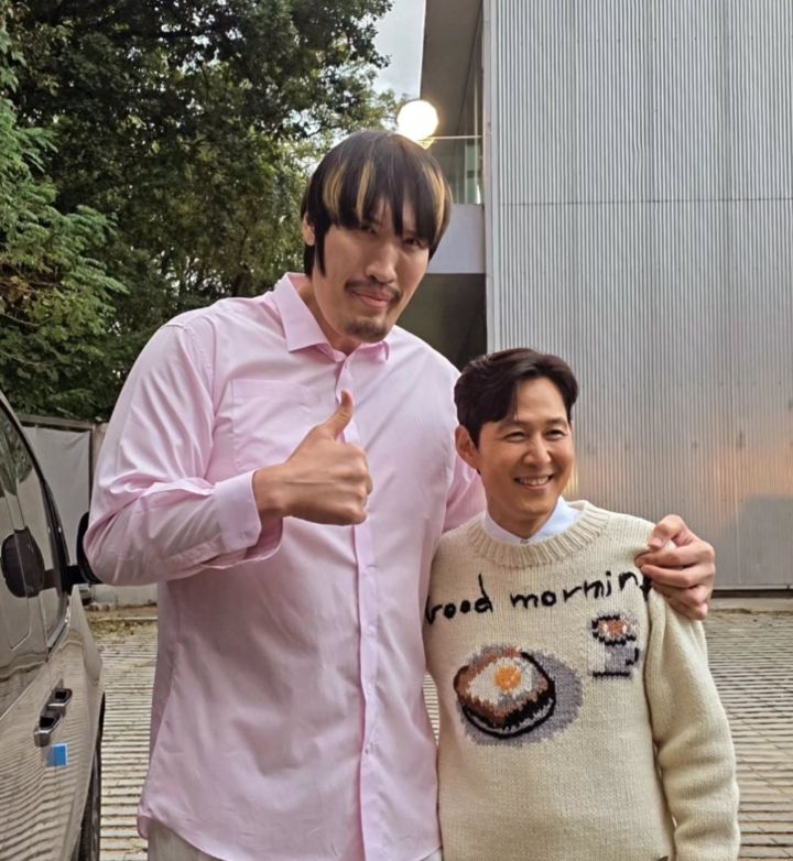 분홍색 셔츠를 입은 최홍만은 이정재의 어깨를 감싸고 엄지를 들어올리는 포즈를 취했다. 180cm 장신의 이정재도 작아보이게 만드는 217cm 피지컬이 시선을 사로잡는다.