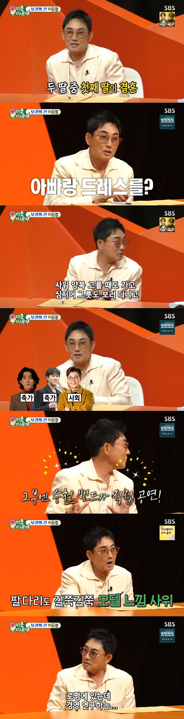 특히 이승철은 사위에 대해 "키가 188cm다. 팔다리가 마네킹 수준으로 길다"며 "우리 딸도 팔다리가 길다. 그래서 손주에 대한 기대가 크다"고 말했다. 또한 "사위는 로펌에서 경영 연구한다. 카이스트를 나왔다"고 자랑했다.