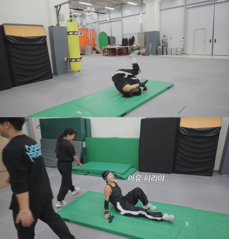 앞구르기 후 총 쏘는 자세를 위해 연습을 거듭한 엄정화는 완벽한 자세를 선보이면서도 "아이고 허리야. 너도 내 나이 되어봐라"라며 드러누워 웃음을 안겼다.