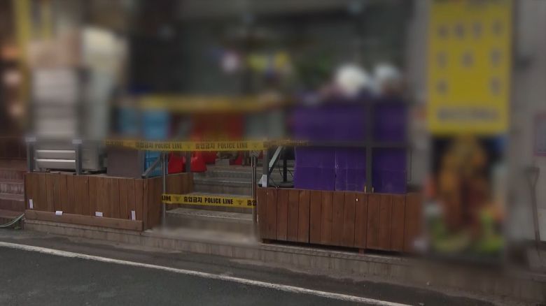 출입 통제선 사이사이, 계단에 묻은 혈흔이 참혹했던 상황을 짐작하게 합니다.