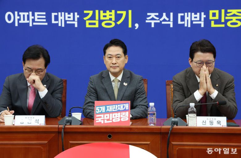 장동혁 국민의힘 대표가 27일 오전 국회에서 열린 최고위원회의에서 “무죄가 확실한 이 대통령 재판을 재개하지 못할 이유가 전혀 없다”며 “이 대통령 5개 재판이 당장 재개돼야 한다”고 주장하고 있다. 2025.10.27 이훈구 기자 ufo@donga.com