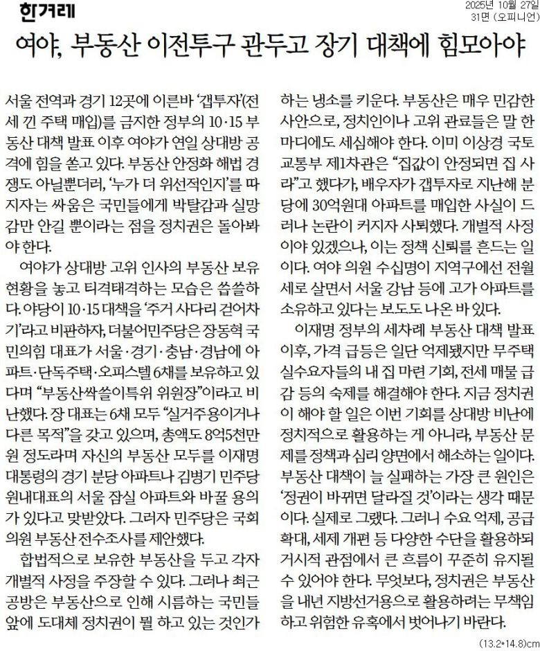 한겨레 = 여야, 부동산 이전투구 관두고 장기 대책에 힘모아야