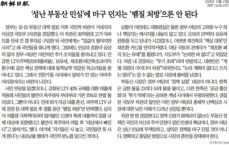 조선 = '성난 부동산 민심'에 마구 던지는 '땜질 처방'으론 안 된다