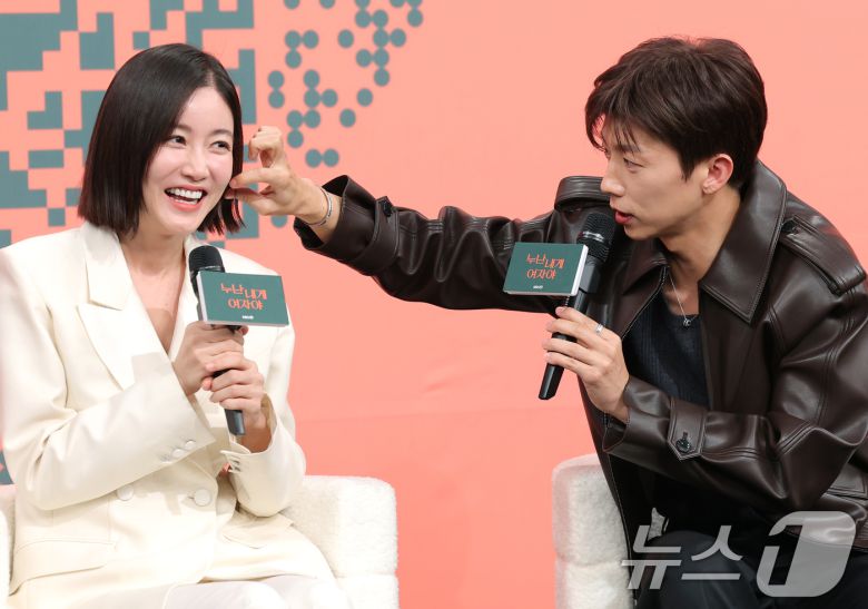 2PM 우영(오른쪽)이 27일 서울 영등포구 KBS 본관에서 열린 KBS 2TV 연상연하 리얼 로맨스 '누난 내게 여자야' 제작발표회에 참석해 황우슬혜 매무새를 고쳐주고 있다. '누난 내게 여자야'는 커리어를 위해 치열한 시간을 보내느라 아직 사랑을 찾지 못한 여성들과 사랑 앞에서는 나이가 숫자에 불과하다고 믿는 남성들의 로맨스를 섬세하게 보여주는 예능이다. ⓒ News1 권현진 기자