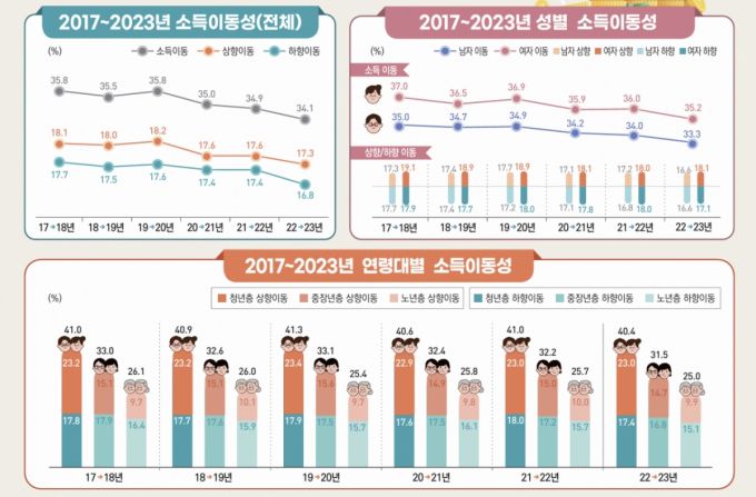 성별로는 여성 이동성이 35.2%로 남성(33.3%)보다 높았으며 특히 상향 이동(18.1%)은 전년 대비 0.2%p 늘었다. 남성은 상·하향 이동이 모두 감소했다.