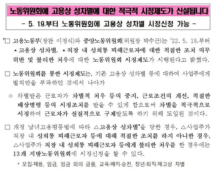 2022년 5월 고용노동부가 고용상 성차별, 직장 내 성희롱에 대한 노동위원회의 적극적 시정제도가 신설된다고 발표한 보도자료. |