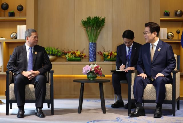 이재명 대통령과 훈 마네트 캄보디아 총리가 27일 말레이시아 쿠알라룸푸르 한 호텔에서 정상회담을 하고 있다.[사진=연합뉴스] |