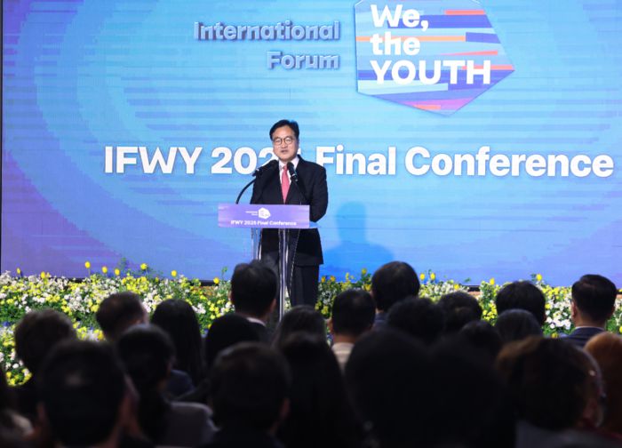 우원식 국회의장이 ‘국제청년포럼(IFWY) 2025 파이널 컨퍼런스 개막식’에서 인사말을 하고 있다. 사진 | 의장 공보수석실