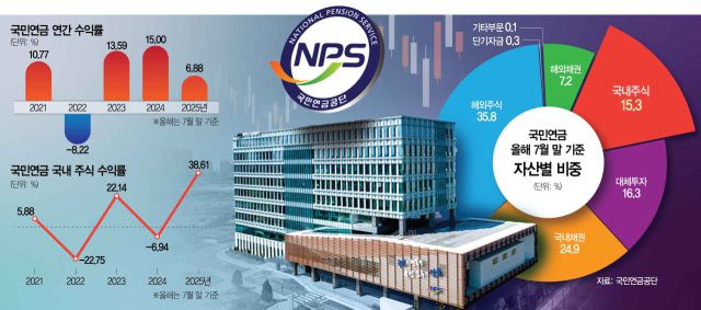 실제로 국민연금 안팎에서도 지난해 세운 15.00%라는 연간 수익률을 넘어설 것이란 분위기다. 7월 기준 국민연금의 수익률은 6.88%로 최대 변수는 대체투자 분야로 꼽힌다. 7월 기준 국내 주식이 38.61%, 해외 주식은 5.21%, 국내 채권은 2.75%의 수익률을 내고 있는 반면 해외 채권(-2.97%)과 대체투자(-1.40%)는 상대적으로 부진한 상황이다. 대체투자 분야에서도 특히 해외 부동산·인프라 분야가 고환율로 인해 저조한 상황이다. 국민연금의 한 관계자는 “연말에 공정가치 평가가 적용되면서 대체투자 분야의 수익률이 회복되면 연간 최대 수익률도 가능할 수 있다”고 말했다.