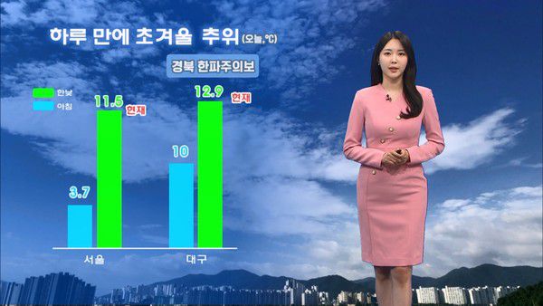 오늘 아침 서울은 3.7도로 어제보다 7도가량 크게 떨어졌고요. 일부 강원도와 경기북부지역은 영하권에서 출발했습니다. 찬 공기가 남쪽으로 이동하며 지금은 경북지역에 한파주의보가 발효중이고요. 서울은 현재기온 11도 안팎으로 종일 춥습니다.