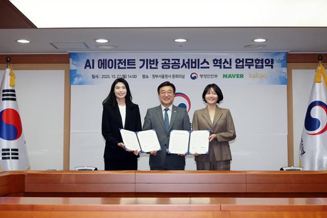 행정안전부는 26일 정부서울청사에서 윤호중 장관과 네이버 최수연 대표, 카카오 정신아 대표가 참석한 가운데 AI 에이전트 기반 공공 서비스 혁신 업무협약을 체결했다.