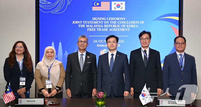 여한구 산업통상부 통상교섭본부장이 26일(현지시간) 말레이시아 쿠알라룸푸르 국제컨벤션센터(KLCC)에서 열린 2025 한-아세안 정상회의 계기 한-말레이시아 FTA 타결 공동선언문 서명식에서 뜽쿠 자프룰(Tengku Zafrul) 말레이시아 투자통상산업부 장관을 비롯한 참석자들과 기념촬영을 하고 있다. (산업통상자원부 제공. 재판매 및 DB 금지) 2025.10.27/뉴스1 |